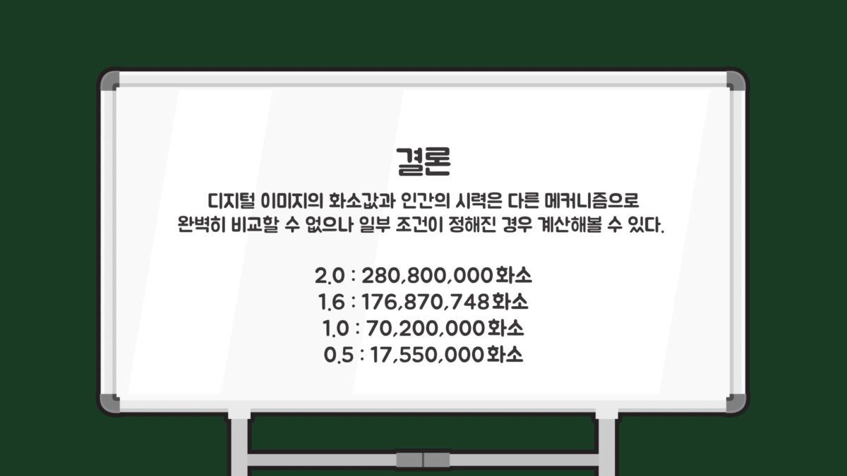 이처럼 시력과 시야각의 차이에 따라서도 화소값이 크게 차이가 납니다. 게다가 사람이 상을 인지하는 데엔 사물의 크기나 빛의 파장, 동공의 크기 등 더 다양한 요인을 복합적으로 고려해야 하므로 앞서 구한 화소값도 실제와 다를 수 있습니다.
