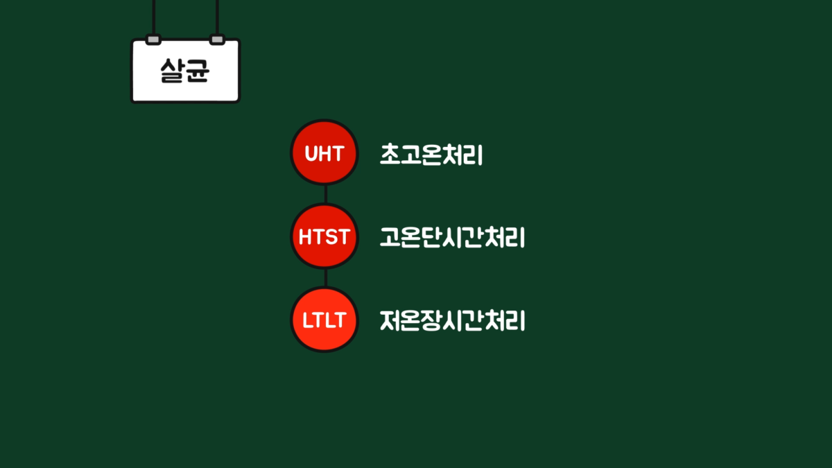 그다음 살균 과정을 거치는데, 살균 방법은 저온장시간처리(LTLT), 고온단시간처리(HTST), 초고온처리(UHT) 등이 있습니다.