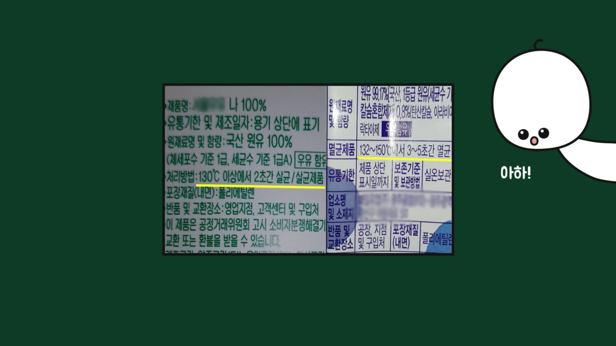 그리고 초고온처리(UHT, Ultra High Temperature)는 130℃ 이상의 온도에서 0.5~5초간 가열하는 방식입니다. 어떠한 살균 방식으로 처리했는지는 우유의 포장지 겉면에 나와 있습니다. 이렇게 살균 처리 후 냉각, 저장, 충전(용기에 담는) 과정을 통해 소비자에게 유통됩니다.