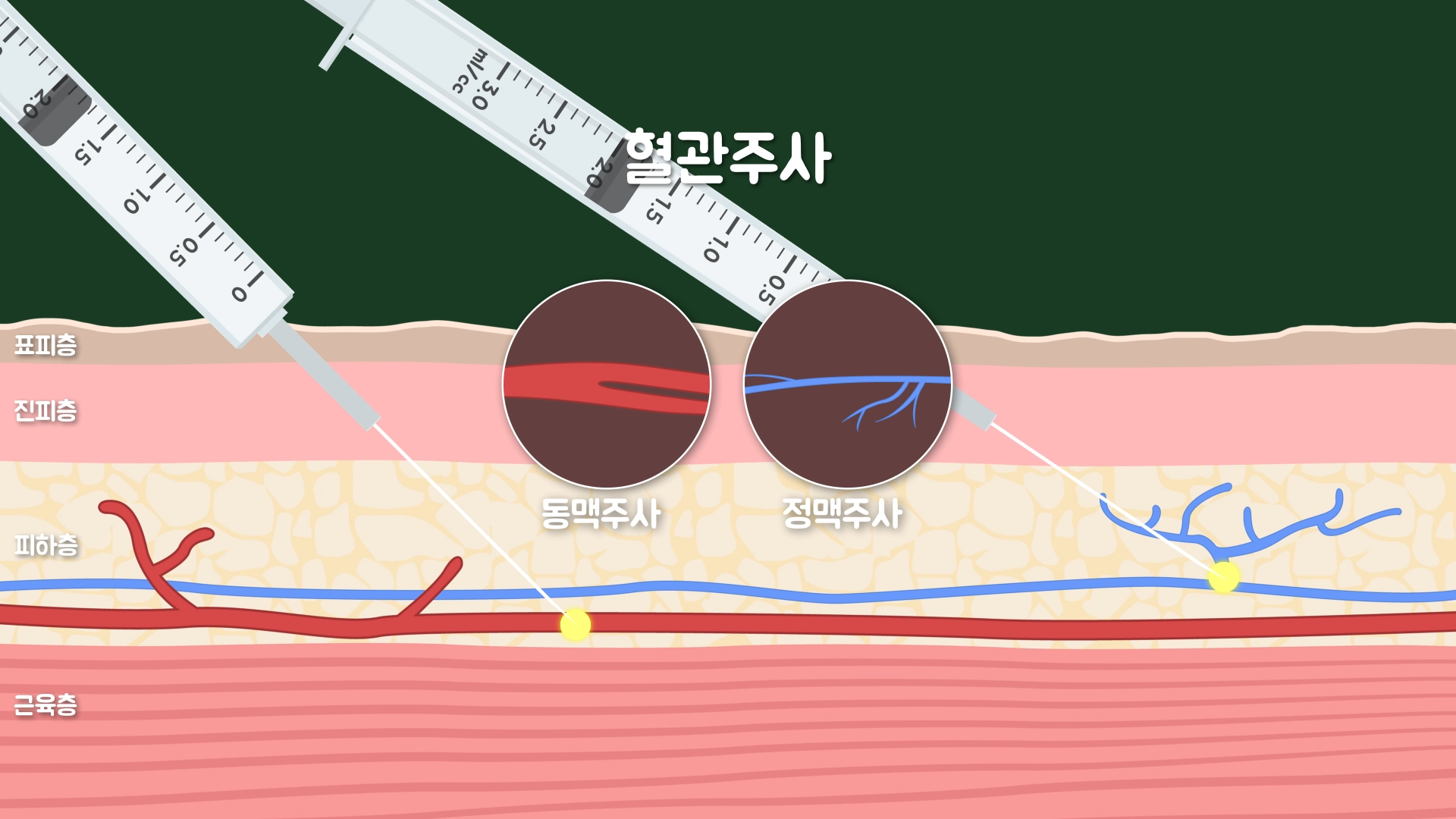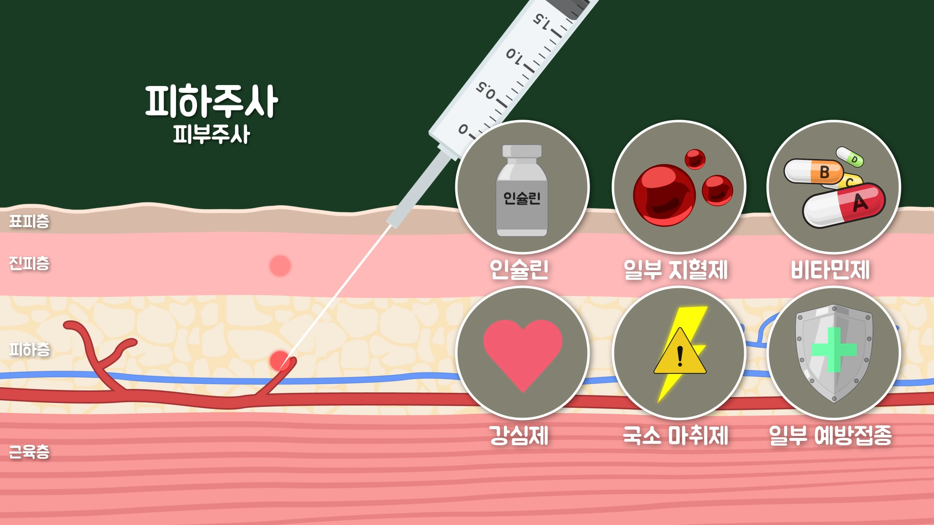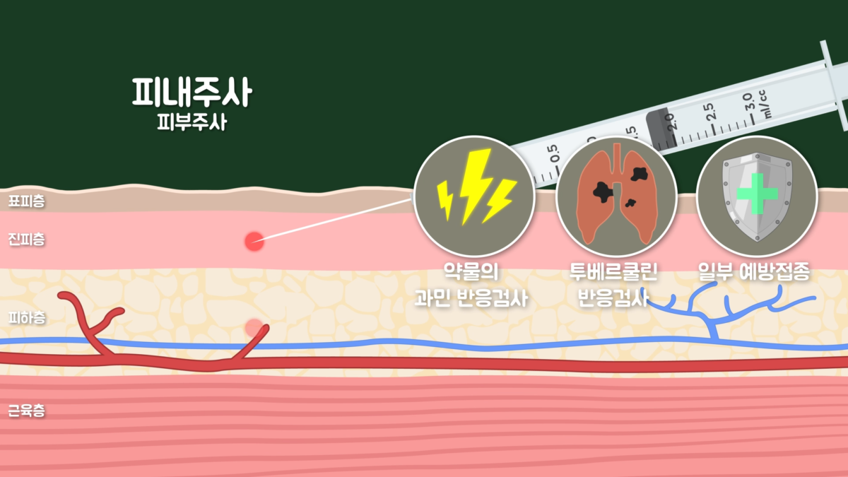 주사는 놓는 부위에 따라 피부주사(피내주사+피하주사)와 근육주사, 혈관주사로 분류할 수 있습니다. 먼저 피부주사는 표피층과 피하조직 사이에 있는 진피층에 주사하면 피내주사, 진피층 아래의 피하층에 주사하면 피하주사로 분류됩니다.