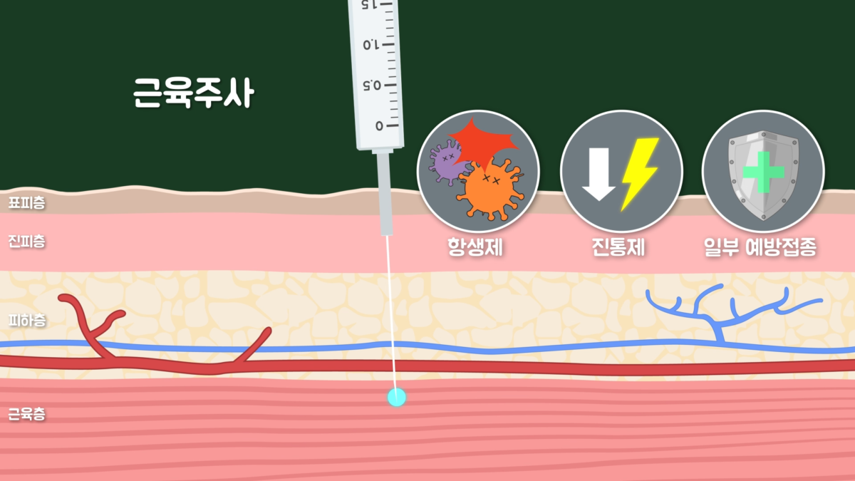 근육주사는 근육에 놓는 주사로 우리가 흔히 맞는 주사입니다. 그리고 혈관주사는 동맥주사와 정맥주사가 있습니다. 주제의 내용은 근육주사와 관련 있습니다.