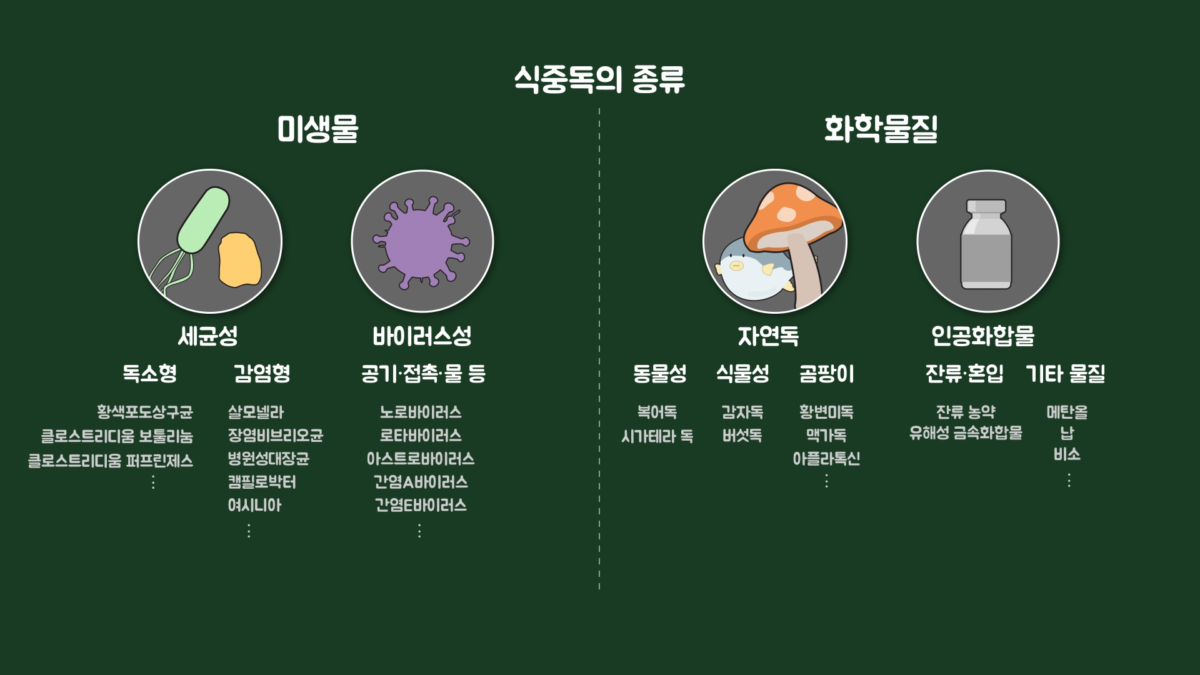 그렇다면 겨울은 식중독균이 증식하는 온도에 해당하지 않으므로 괜찮지 않을까요? 식중독의 원인은 아래와 같이 분류할 수 있습니다. 주로 여름철에는 세균성 식중독이, 겨울철에는 바이러스성 식중독이 발생합니다.