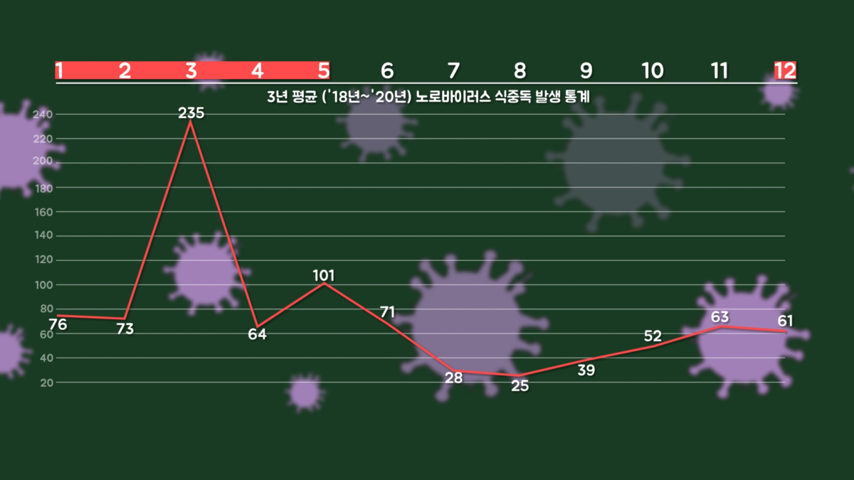 바이러스성 식중독의 대표적인 원인이 되는 노로바이러스(Norovirus infection)는 바이러스를 구성하는 유전정보전달물질(RNA)이 낮은 온도에서 더 잘 보존되므로 기온이 낮은 12월부터 5월까지 많이 발생하다가 따뜻해지면서 줄어드는 특징을 보입니다.