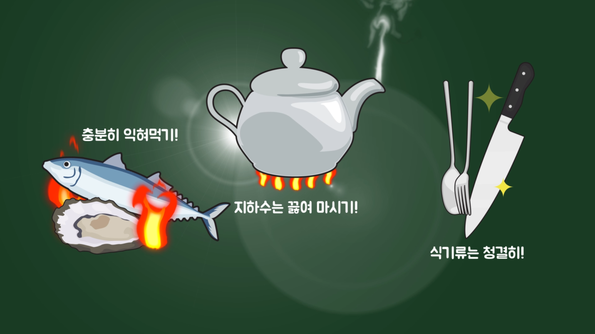 노로바이러스는 입자가 작고 표면 부착력이 강해 비누를 이용해서 흐르는 물에 깨끗히 손을 씻어줘야 합니다. 그리고 어패류를 조리할 때는 85℃ 이상의 온도에서 1분 이상 익혀 먹고, 채소와 과일은 흐르는 물에 깨끗이 씻어서 먹어야 하며, 지하수는 반드시 끓여 마셔야 합니다.