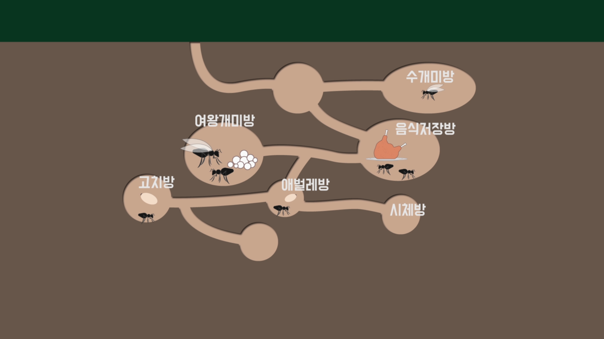 개미집의 방은 각자 쓰임이 존재합니다. 여왕개미방, 고치방, 애벌레방, 음식저장방, 수캐미방, 시체방 등 인간들이 방을 구분해서 사용하는 방식과 비슷하게 방의 역할을 구분해서 사용합니다.