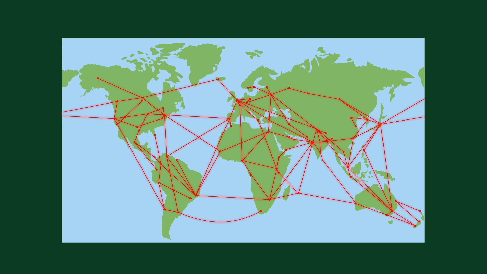 우리나라에는 총 54개의 항공로가 있고, 비행기는 정해진 항공로만을 따라서 인천·김해·제주공항 등 국내선과 중국이나 미주, 일본 등 국제선을 운행하고 있습니다. 마찬가지로 다른 나라도 항공로가 있고, 위와 같이 세계가 연결되어 있어서 이 항공로만을 통해 비행하고 있습니다.