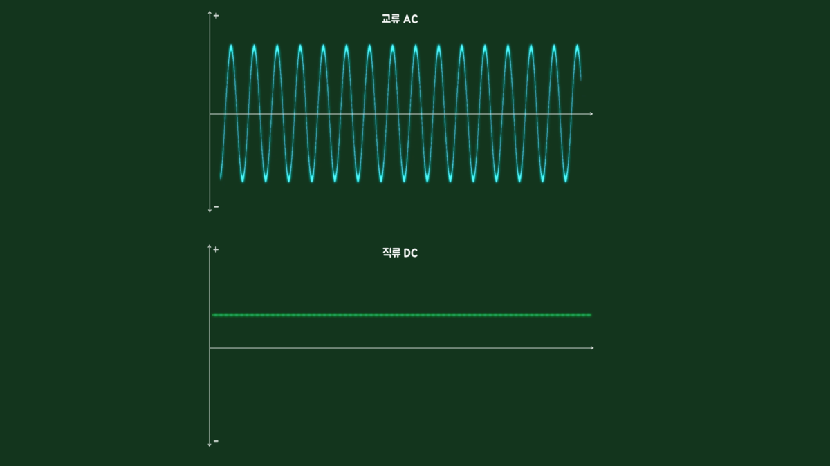 가정에 공급되는 전기는 교류 220V에 60Hz로 1초에 60회의 진동을 거쳐 들어옵니다. 여기서 교류는 시간의 흐름에 따라 크기와 방향이 계속 변하는 전기이고, 직류는 시간이 흐르더라도 크기와 방향이 일정한 전기입니다.