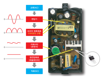 어댑터는 변압기와 다이오드, 콘덴서, 레귤레이터 등으로 구성되고, 해당 부품들을 거치면서 단계에 따라 교류 전기를 직류 전기로 변환해줍니다.