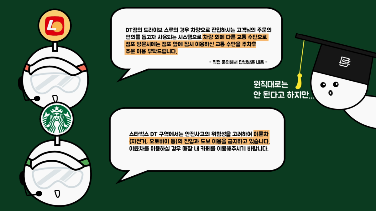 그렇다면 스타벅스는 어떨까요? 스타벅스도 여러 지점에서 드라이브 스루 매장을 운영하고 있는데, 안전사고의 위험성 때문에 도보 및 이륜차 이용은 원칙적으로 금지하고 있다고 합니다. 드라이브 스루를 이용하는 중에는 사고가 발생하기 쉬우므로 자동차 외 탈 것 이용 시에는 매장 내부에서 주문하는 것을 권장합니다.
