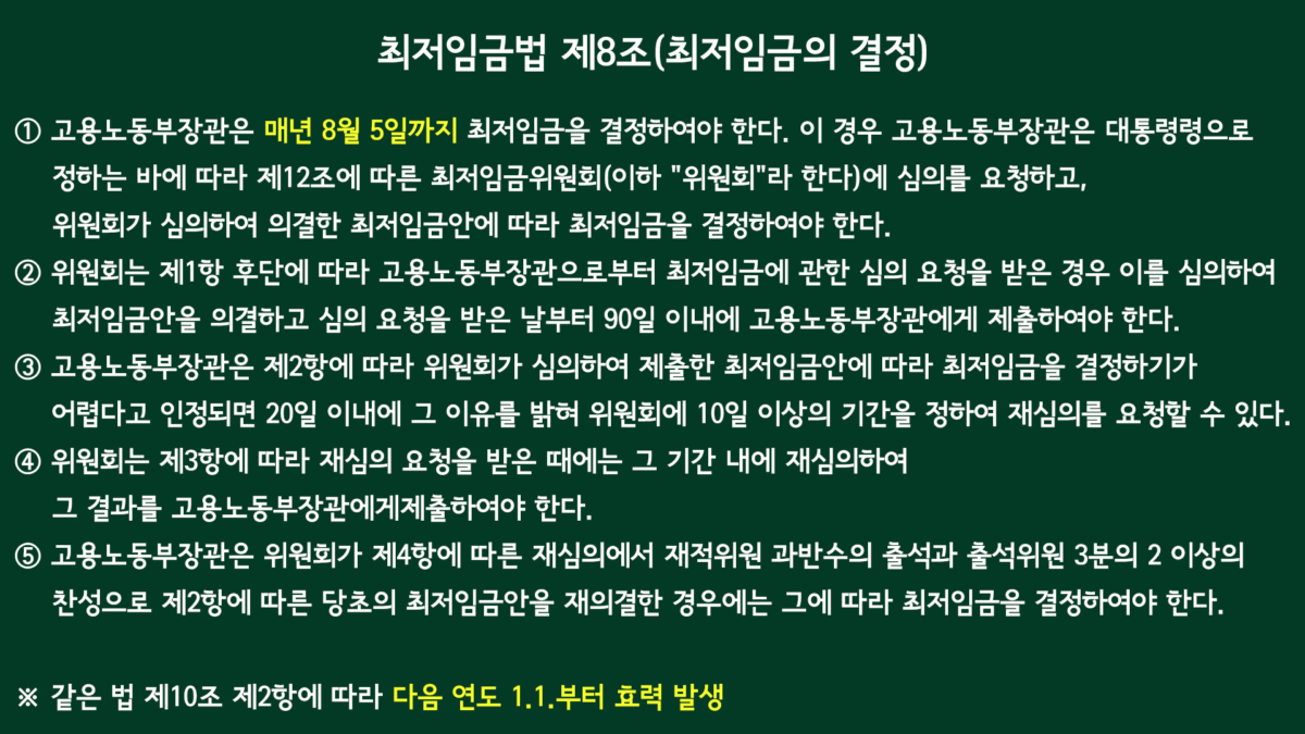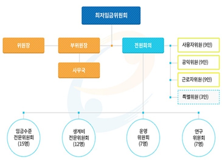 최저임금은 최저임금위원회의에서 결정합니다. 위원회의 구성은 근로자위원 9명(노동계)과 사용자위원 9명(경영계), 공익위원 9명 등 총 27명이고, 이들은 회의를 통해 고용노동부 장관의 확정고시일(*8월 5일) 20일 전까지 무조건 합의안을 도출해야만 합니다.