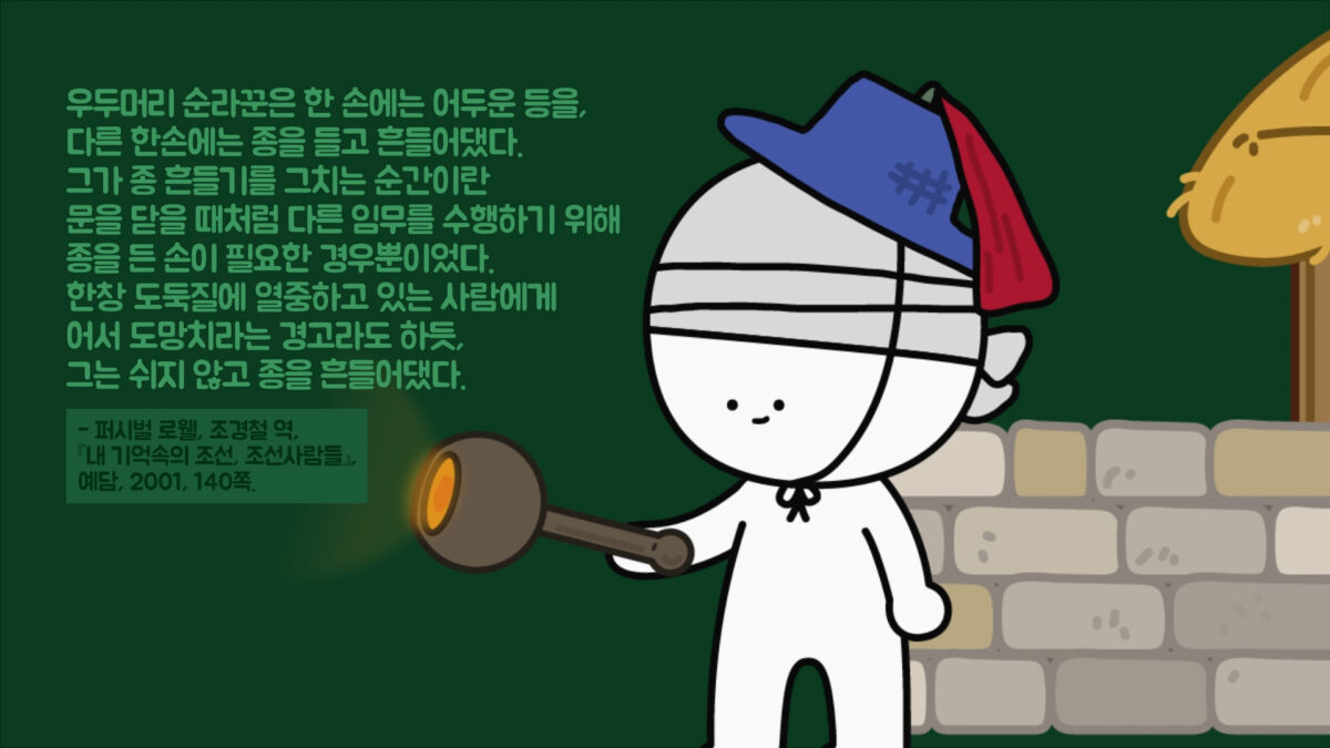 정리해보면 조선시대 때 일반 마을에서는 도적 떼의 위험은 있었으나 일상 속 방범에 대한 문제는 고민하지 않아도 됐고, 현대와 사는 것이 비슷했을 것으로 추정되는 수도 한양에서는 야간 통금 정책이 방범 장치의 역할을 한 것으로 보입니다. 궁금증이 해결되셨나요?