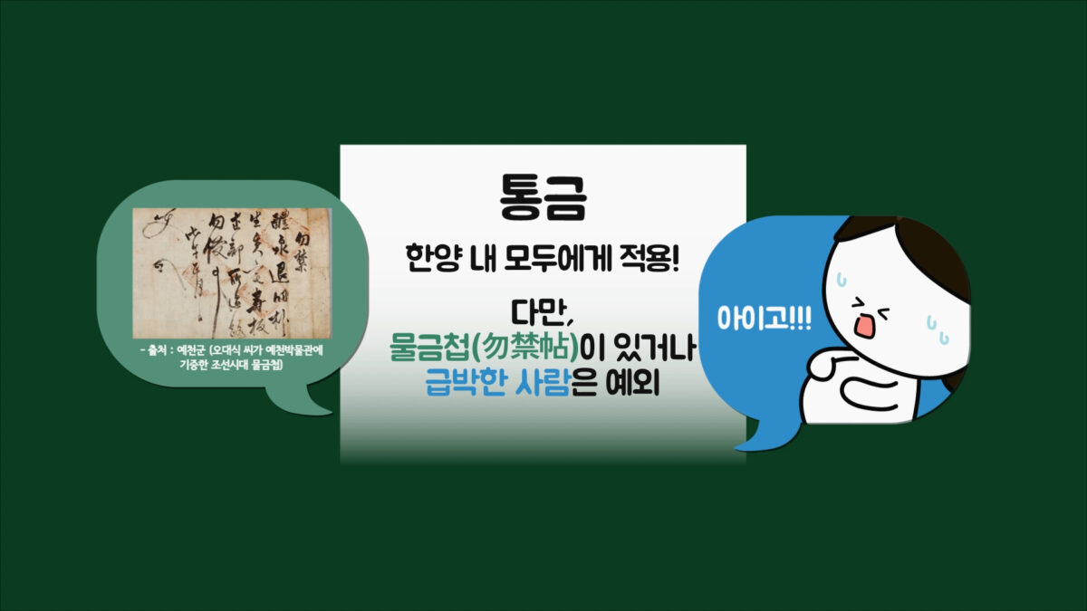 통금은 한양에 출입하는 모든 사람에게 적용됐으나 승정원에서 발급한 예외 허가 문서인 물금첩(勿禁帖) 등의 문서를 소지했거나 질병이나 출산 등으로 급박한 사정에 처한 사람은 예외로 두었습니다. 참고로 야간 통금은 어긴 시간대에 따라 처벌 강도가 달랐다고 합니다.