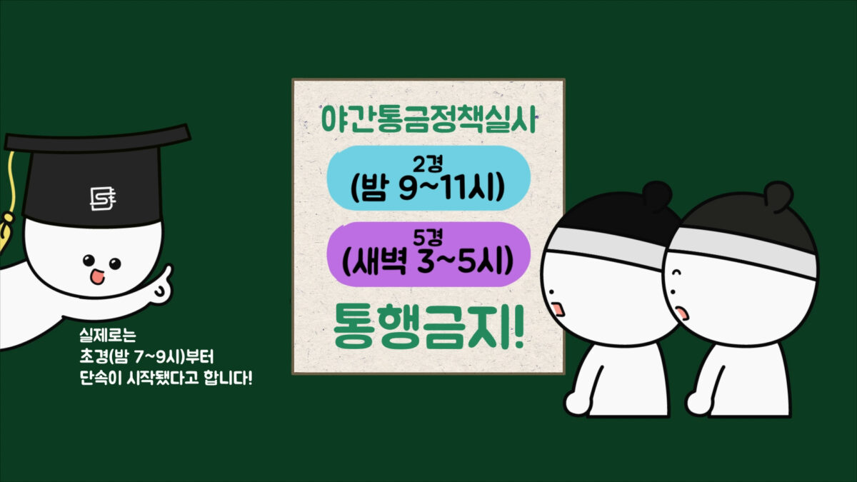 한양은 도성 방비와 치안을 목적으로 2경(밤 9~11시)부터 5경(새벽 3~5시)까지 나이와 신분에 관계없이 전면적으로 통행을 금지했습니다.