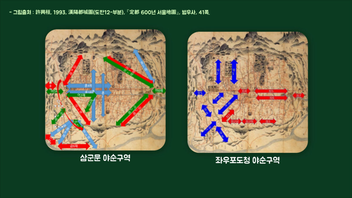 통금 시간 때는 포도청의 포졸과 한양 일대에 배치된 군대인 삼군문 군인이 순찰을 하였는데, 포도청은 한양 도성 내외를 16개 구역으로 나누어 순찰을 하였고, 조선 후기 숭례문 바깥에도 거주 구역이 확장됐을 때는 숭례문 바깥쪽에 4개 구역을 집중 배치하기도 했습니다.