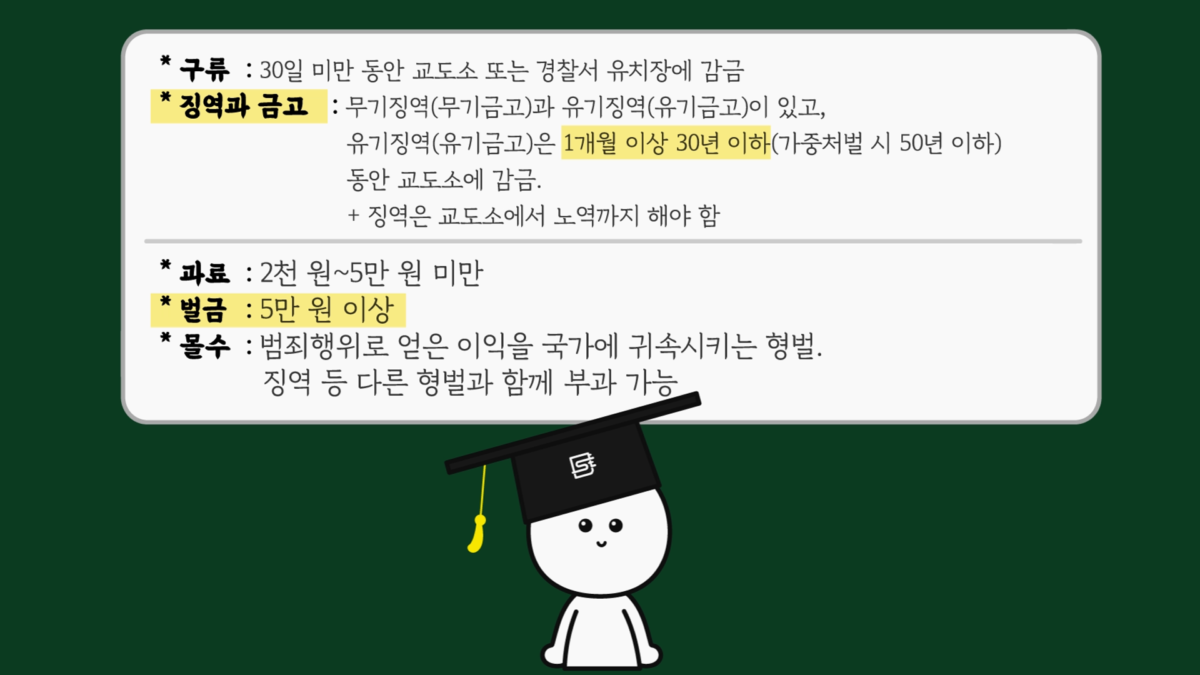 감금 기간이 며칠인지 벌금은 얼마인지 등에 따라 명칭에 차이가 있고, 대부분 형사법에서의 형벌은 이와 같은 징역과 벌금으로 이루어져 있습니다.