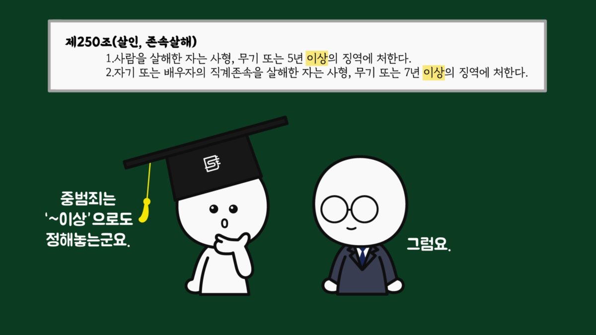 보통 살인처럼 무거운 범죄들이 ‘~이상’으로 규정되어 있으므로 우리나라 형사법은 ‘~이하’뿐만 아니라 ‘~이상’으로도 형벌의 범위를 정하고 있습니다. 즉, ‘~이하’만 있는 것이 아닙니다.