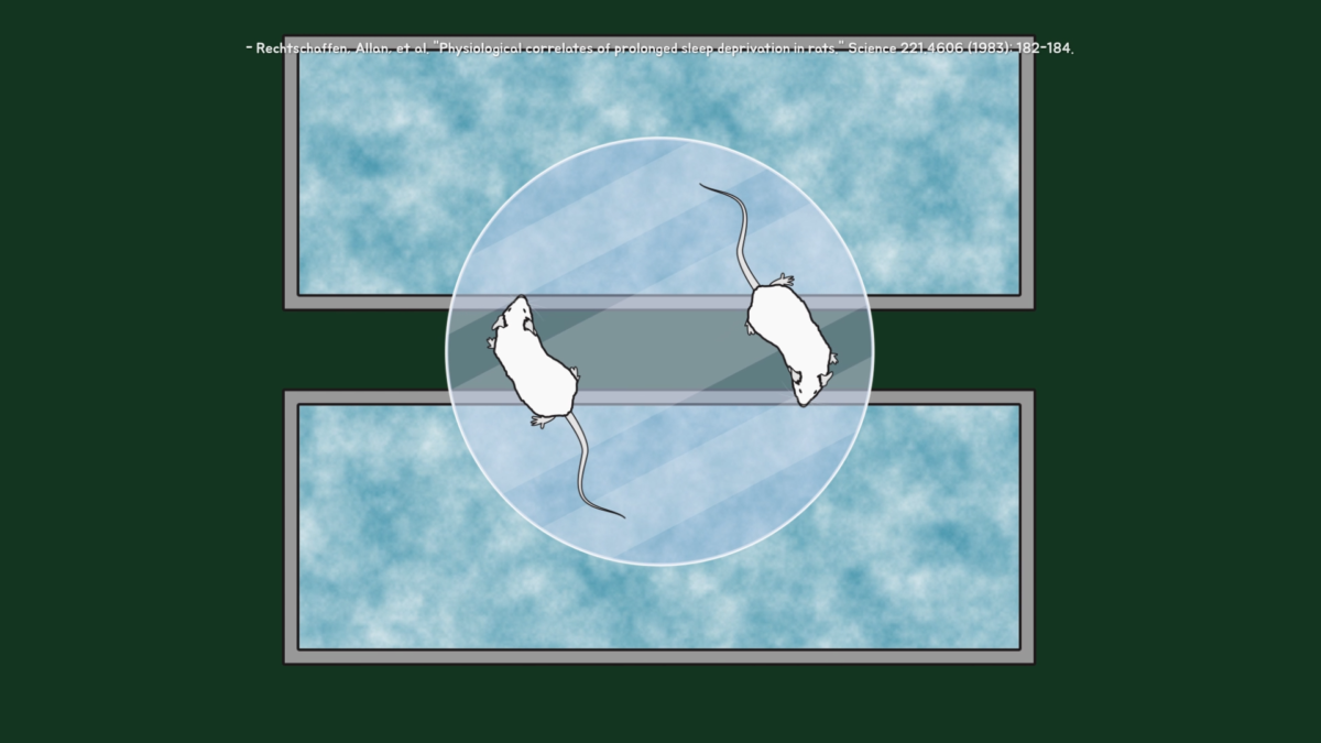 또 시카고대학교(University of Chicago)의 한 연구팀이 쥐를 이용해 진행한 실험이 있습니다. 물 위에서 회전하는 유리 원판에 쥐를 올려놓고 잠을 못 자게 한 뒤 상태 변화를 관측했는데, 그 결과 음식을 섭취했음에도 체중이 감소했고, 피부에 병변이 생겼으며, 다발성 장기 손상이 일어난 후 약 2주에서 한 달 사이에 죽었습니다.