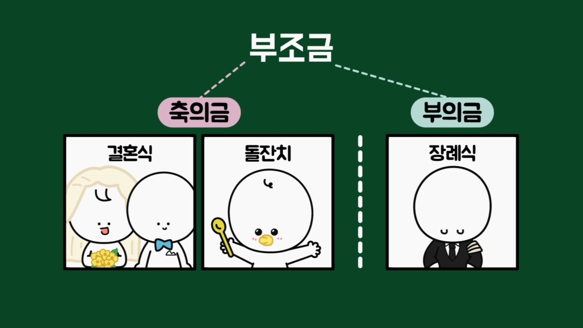 이러한 문화는 결혼식뿐만 아니라 장례식이나 돌잔치 등에서도 이루어집니다. 포괄적인 용어는 부조(扶助)금이라고 하고, 크게 좋은 일에 내는 축의금과 슬픈 일에 내는 부의금으로 나누어집니다.
