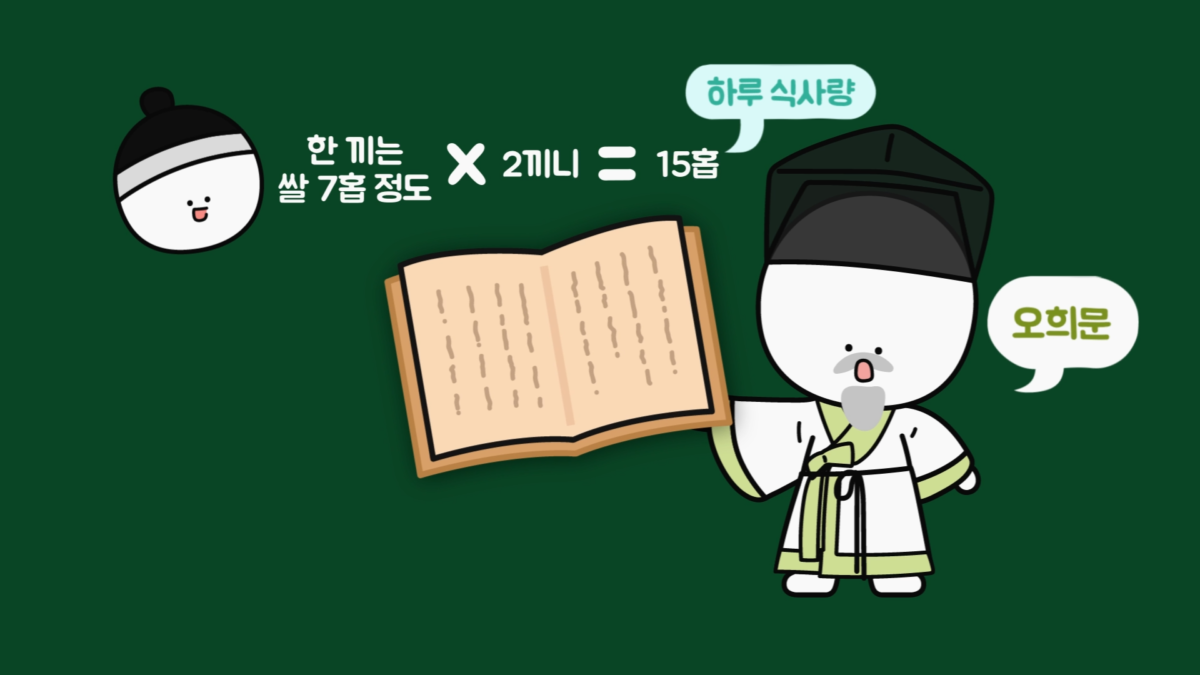 임진왜란 때 학자 오희문에 의해 작성된 일기 『쇄미록(瑣尾錄)』에 따르면 조선시대 때 일반적인 성인 남성은 한 끼에 쌀 7홉 이상을 먹었다고 합니다. 당시 식사는 하루 두 끼가 원칙이었으므로 대략 15홉을 하루 식사량으로 가정할 수 있습니다.
