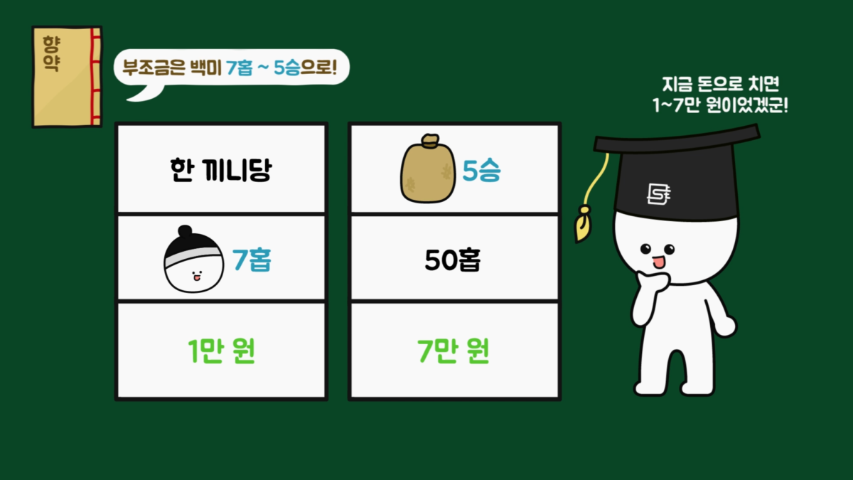 기타 다양한 향약에서는 개인당 결혼 부조금을 적게는 백미 7홉에서 많게는 5승까지 규정했고, 닭이나 대구 등 고기와 생선으로 규정한 곳도 있었습니다. 돈으로 규정하지 않은 이유는 조선의 화폐 정책이 오랜 기간 자리 잡지 못해서 동전이 보급된 후에도 쌀이나 식량 등을 통해 물물교환을 많이 했기 때문으로 추정합니다.