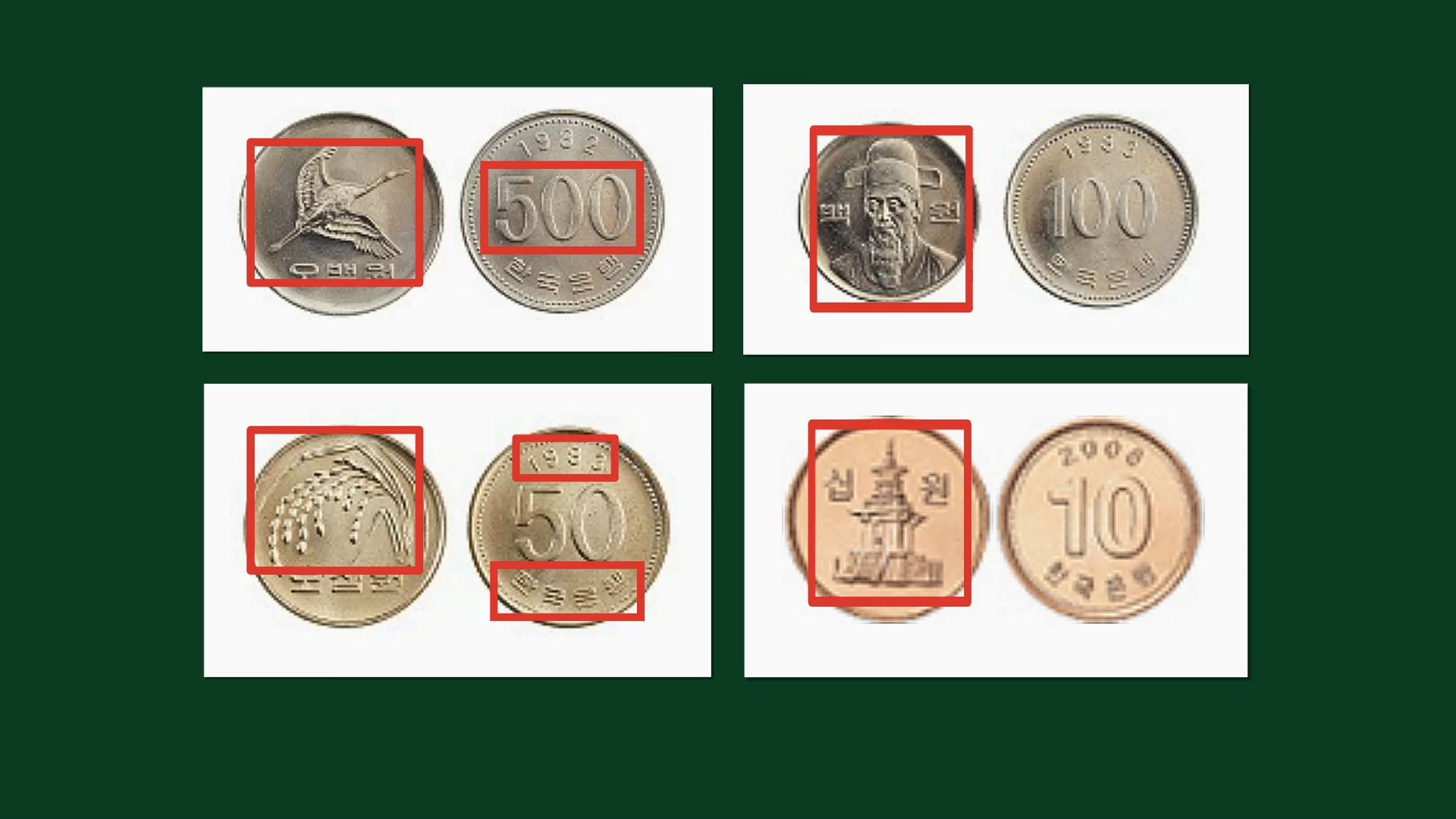 다음으로 각각의 주화를 보면 액면 금액과 선정된 문양, 발행기관, 발행연도 등이 있습니다. 여기서 주제의 의문이 생깁니다. 지폐에는 왜 발행연도가 없고, 주화에는 별거 없이 발행연도만 있는 걸까요? 한국은행 발권정책팀에 문의해서 답변받았습니다.