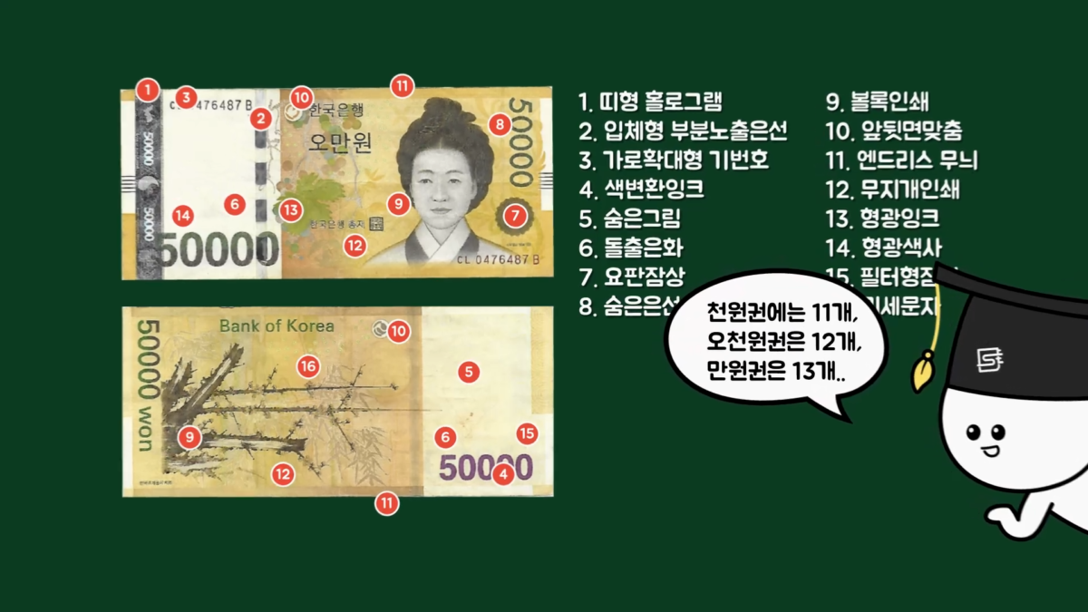 현재 유통되는 지폐는 천원권, 오천원권, 만원권, 오만원권이 있고, 주화는 십원권, 오십원권, 백원권, 오백원권이 있습니다. 각각의 지폐를 보면 액면 금액과 선정된 인물 초상, 그림, 발행기관, 기호와 번호 등이 있습니다.