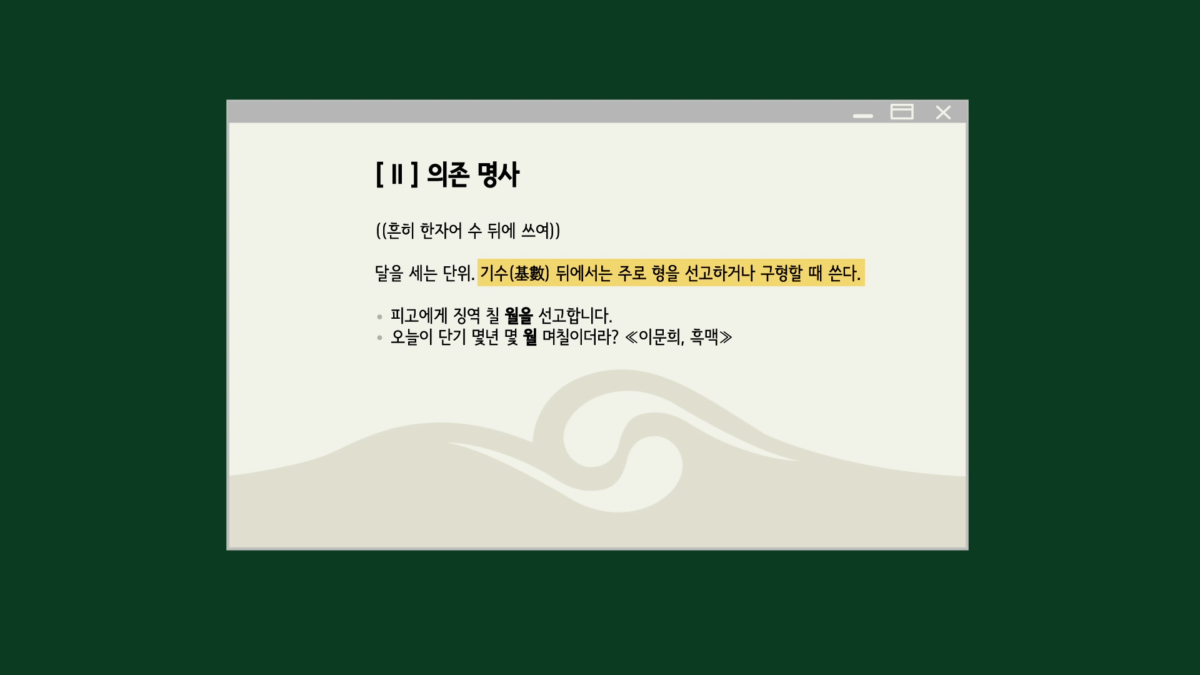 일단 표준국어대사전에 따르면 기수(基數) 뒤에서는 주로 형을 선고하거나 구형할 때 쓰는 의존명사로 ‘월(月)’이 등재되어 있습니다.