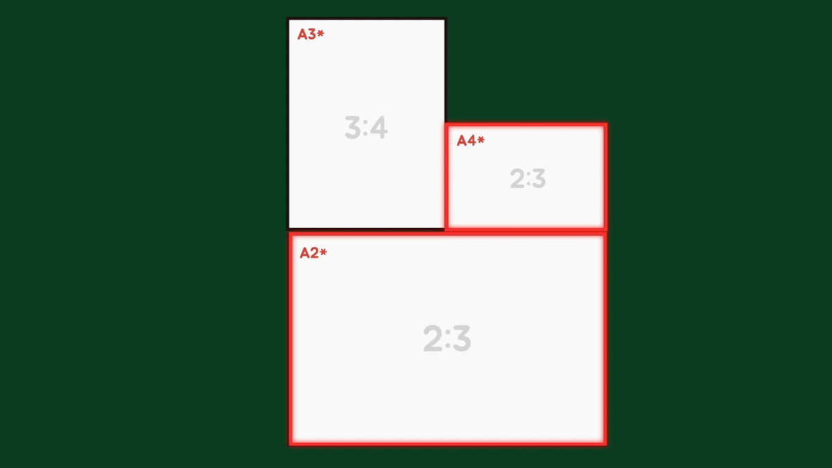 다시 A3* 용지 2장를 붙여서 A2*(400㎜ x 600㎜)를 만들면 비율이 2:3으로 나오긴 해도 A1*을 만들면 다시 3:4의 비율이 나옵니다.