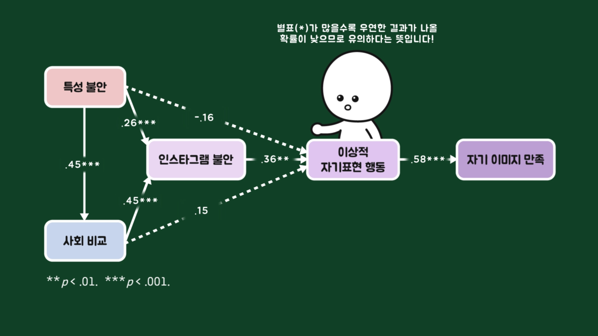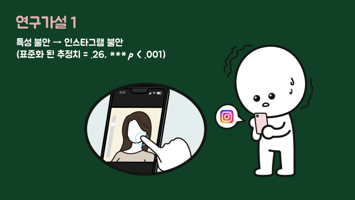 정리해보면 특성 불안 점수가 높을수록 사회 비교를 많이 하는 경향이 있고, 인스타그램을 이용하는 경우 인스타그램 불안을 경험할 수 있으며, 이것이 사진을 보정하는 행동으로 이어진 뒤 자기 이미지 만족으로 이어지는 경험을 할 가능성이 있습니다.