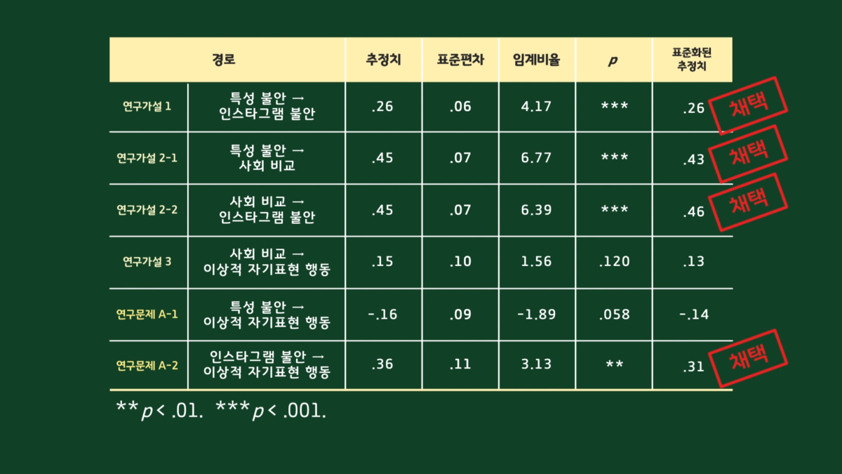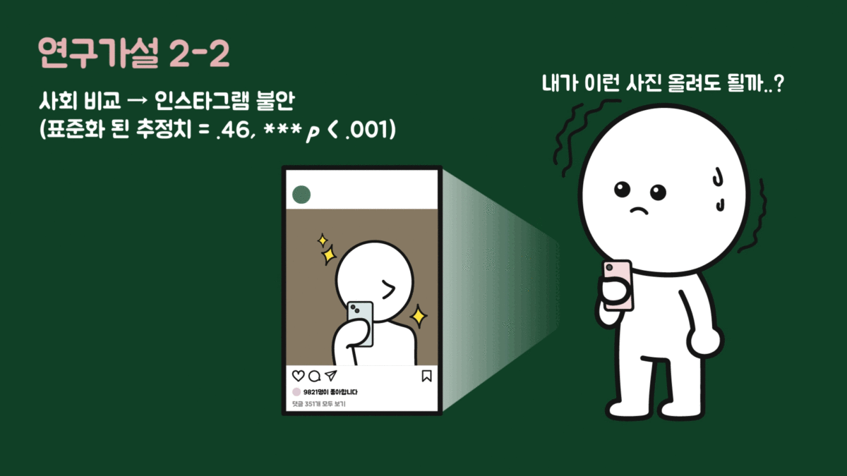 각설하고, 분석 결과에 따르면 특성 불안이 있는 사람은 인스타그램을 이용할 때 불안을 느끼고(연구가설 1), 자신이 처한 상황에 대해 타인과 비교하는 사회 비교도 많이 합니다(연구가설 2-1).