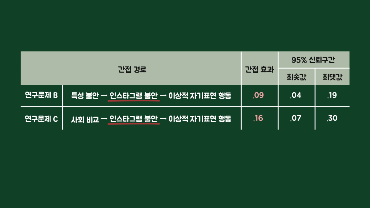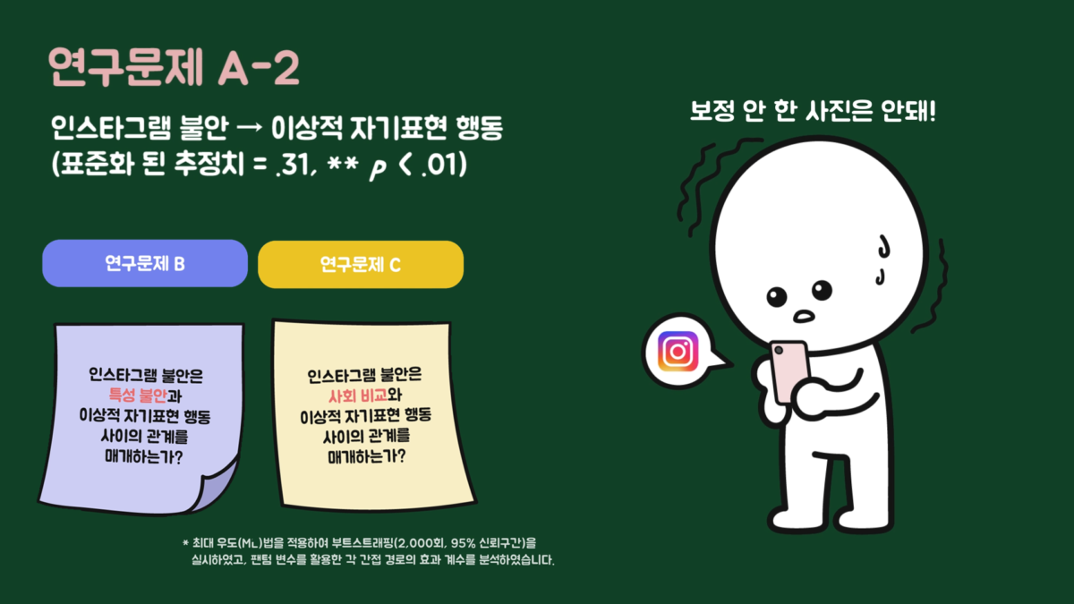 그런데 인스타그램 불안을 느낄 때에는 사진 보정 행동으로 이어졌는데(연구문제 A-2), 높은 특성 불안과 사회 비교 경향이 인스타그램 불안에 영향을 준다고 했으므로(연구문제 1, 연구문제 2-2) 특성 불안과 사회 비교가 사진 보정 행동의 관계를 인스타그램 불안이 어떻게 연결하는지 확인할 필요가 있습니다.
