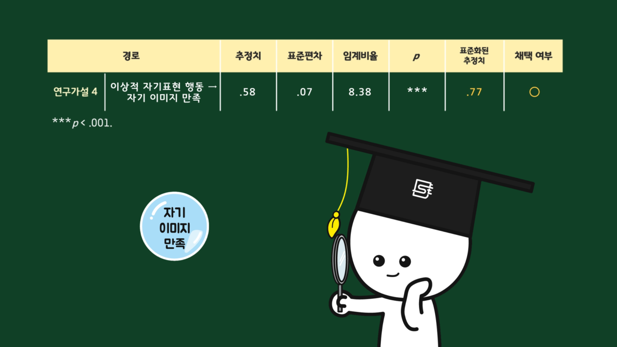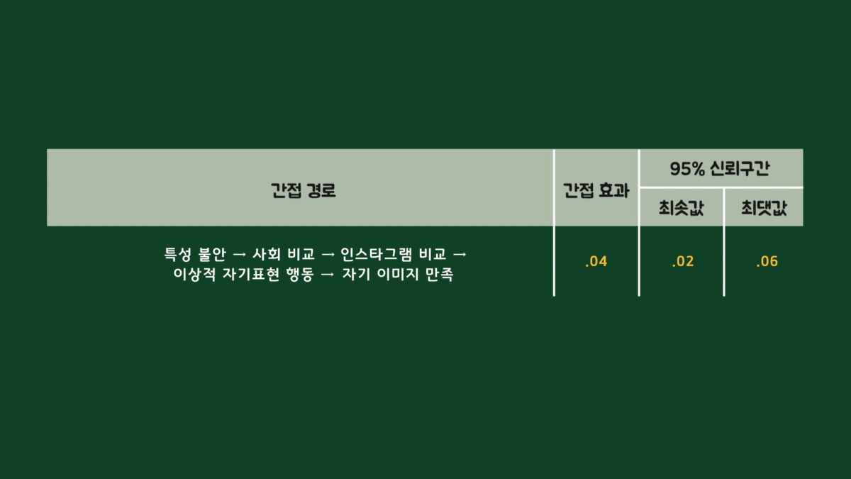 동시에 특성 불안에서 시작해 자기 이미지 만족에 이르기까지의 전체 과정의 연관성도 살펴봤는데, 연관성은 약한 편이어도 통계적으로 유의미한 결과를 얻었습니다.