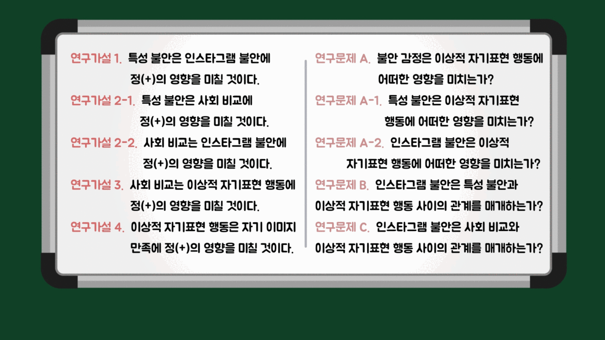 그리고 사회 비교를 많이 하는 사람은 인스타그램 불안을 쉽게 느낄 수 있는데(연구가설 2-2), 특성 불안 점수가 높거나 사회 비교 경향이 있다고 해도 사진 보정 행동으로는 이어지지 않았다고 합니다(연구가설 3, 연구문제 A-1).