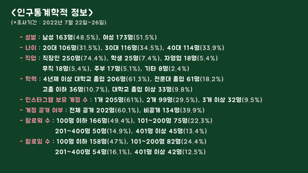 다음으로 인구통계학적 정보를 보면 연구 대상은 인스타그램 이용자임과 동시에 사진 보정 경험이 있는 20세 이상 49세 이하의 성인 총 336명이고, 온라인 설문조사를 진행해 데이터를 얻어 분석에 활용했습니다.