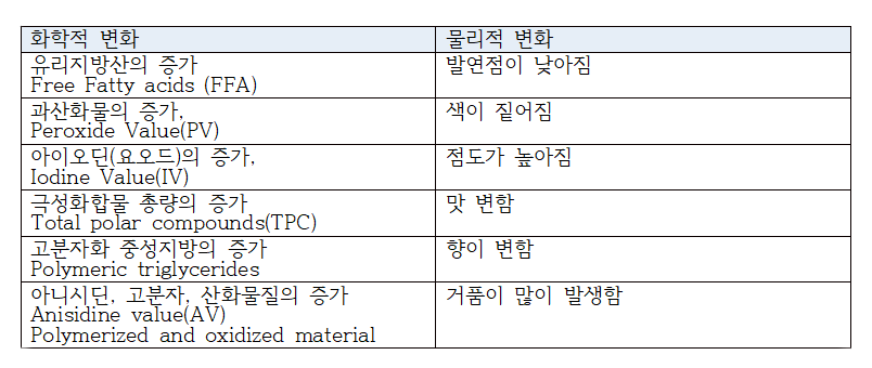 이를 기름의 열화(Degradation)라고 하고, 일반적으로 기름이 열화하면 유리지방산·과산화물·요오드·극성화합물 총량·고분자화 중성지방들이 증가하는 등의 화학적 변화로 인해 발연점이 낮아져 같은 온도에서 연기가 더 많이 발생하고, 색과 점도는 짙어집니다. 또한, 맛에 변화가 생기며, 거품이 많이 발생하는 등의 물리적 변화들이 나타납니다.