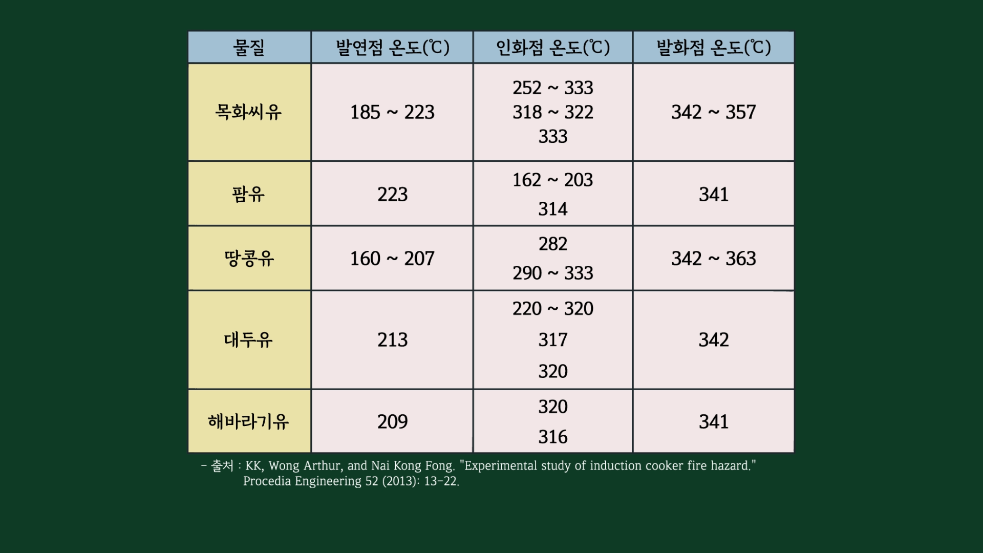 기름을 계속 가열하면 물을 가열했을 때처럼 보글보글 끓지 않고, 어느 순간 계속 연기만 나는데, 연기가 나기 시작하는 온도를 발연점(Smoking point)이라고 합니다. 그리고 발연점 이상으로 기름을 가열하면 스파크나 불꽃이 있는 경우 불이 붙는 최소 온도인 인화점(Flash point)에 도달하게 됩니다.