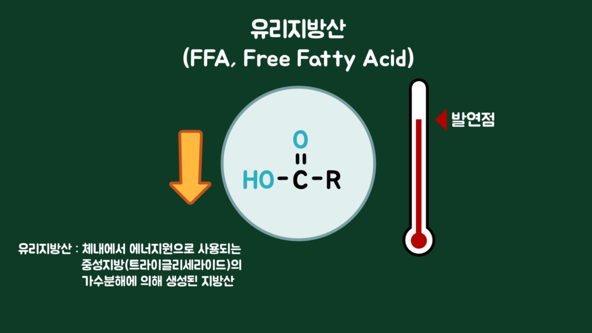 발연점은 각 기름의 고유 특성이고, 기름의 품질과는 무관합니다. 일반적으로 유리지방산(FFA, Free Fatty Acid)이라는 물질의 함유량이 낮을수록 발연점이 높고, 발연점 이상에서 발생되는 연기에 몸에 좋지 않은 독성물질이 많이 포함됐다고 알려졌습니다.