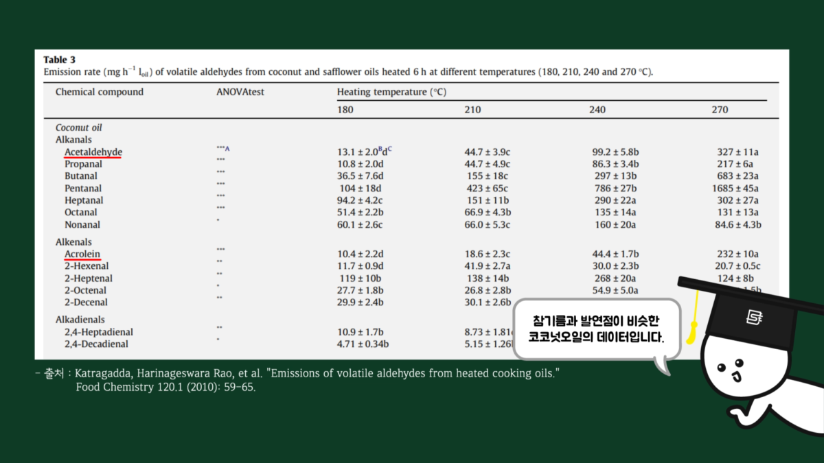 휘발성 유기화합물의 주요 물질에는 알데하이드, 케톤, 알코올, 다이엔, 산, 아클로레인 등이 있고, 이중 주요 발암물질인 알데하이드류를 살펴보면 가열 온도가 높을수록 발생하는 휘발성 유기화합물의 방출 속도도 빨라짐을 알 수 있습니다.
