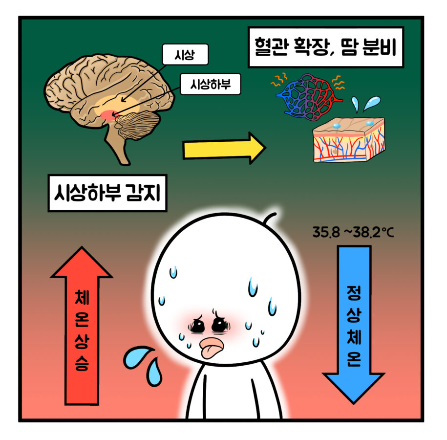 방법을 보면 뇌 시상하부에 자리한 수용체들이 체온 상승을 감지하면 순환계에서는 열을 좀 방출할 수 있게 피부 쪽으로 더 많은 피를 보내라고 신호를 보냅니다.