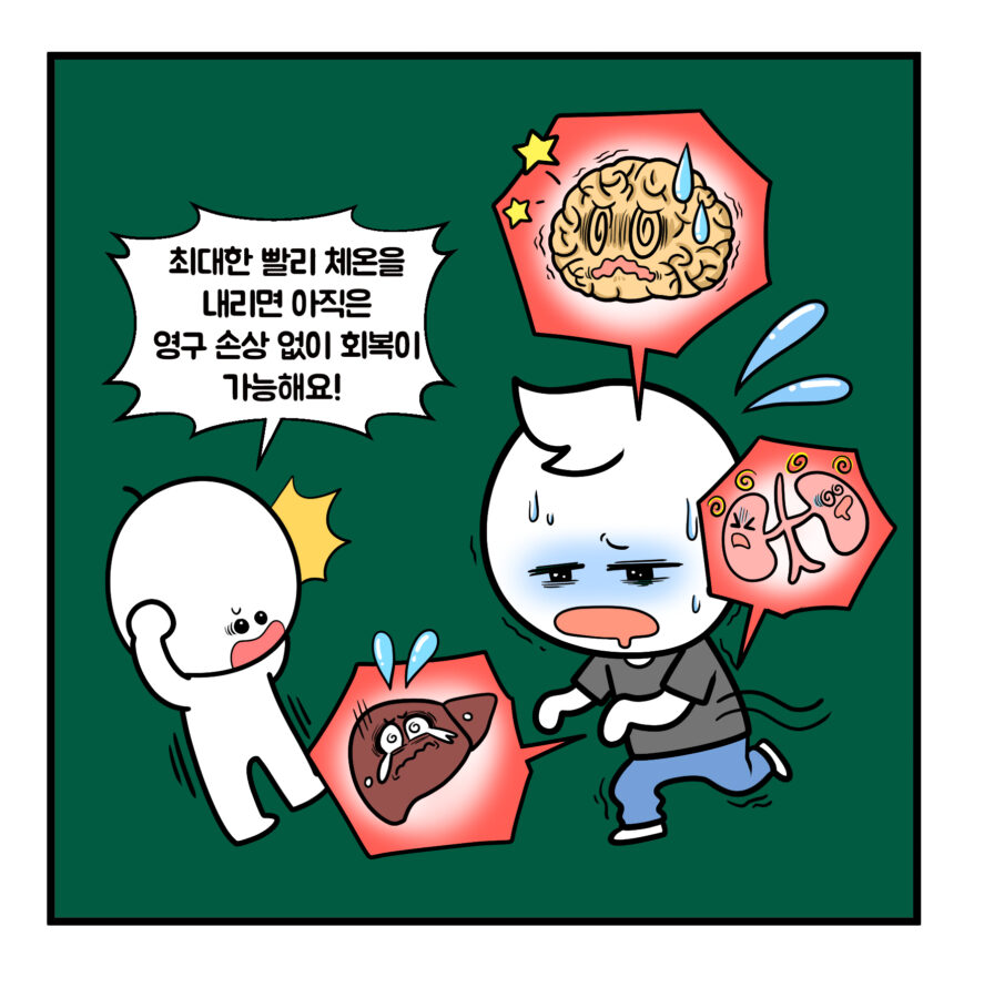 체온이 41.6℃를 넘으면 몸의 세포가 손상되기 시작하고, 장기들이 망가집니다. 이 와중에 우리 몸의 순환계는 혈액 응고에 반응하여 신체 중요 기관들로 가는 혈액의 흐름을 차단하는 응고 연쇄반응이 일어나면서 온몸 구석구석에 출혈이 생기며 죽음에 이르게 됩니다.