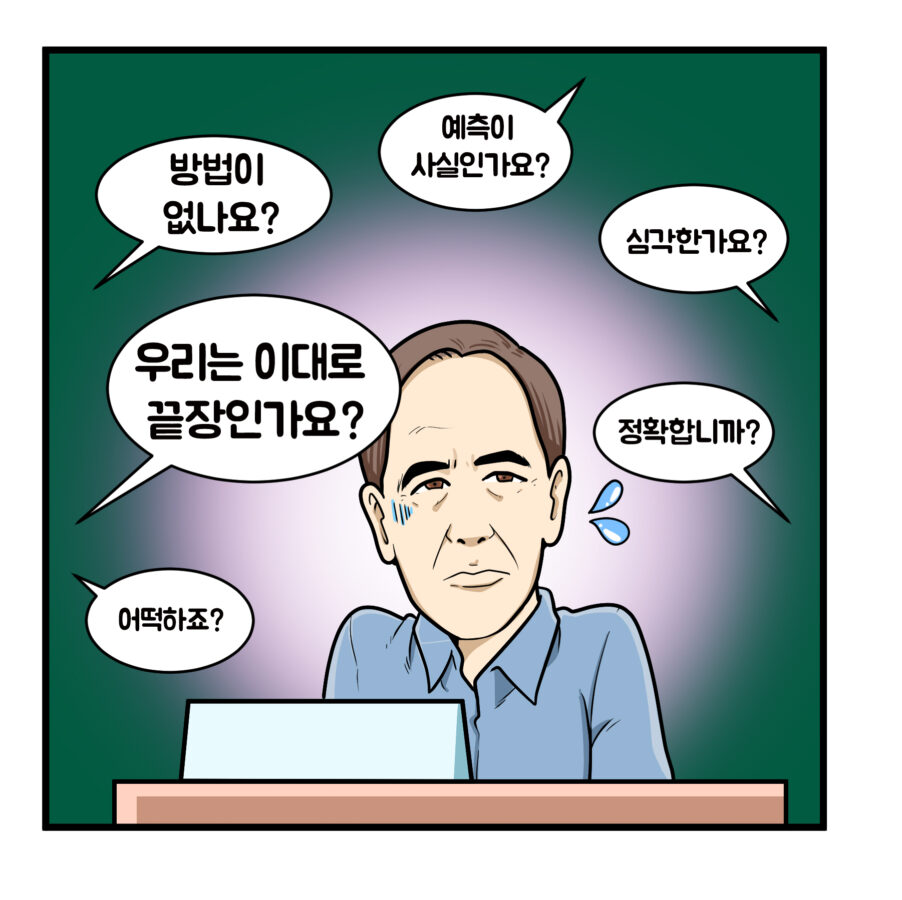 저자의 답을 옮겨서 적어본다면 “내일이 어떤 모습이 될지는 우리가 오늘 어떤 행동을 취하느냐에 달려 있다.”라고 합니다. 기후 문제에 대해서 인식한다면 본인 스스로가 무엇을 해야 할지 생각해 수 있을 겁니다. 궁금증이 해결되셨나요?