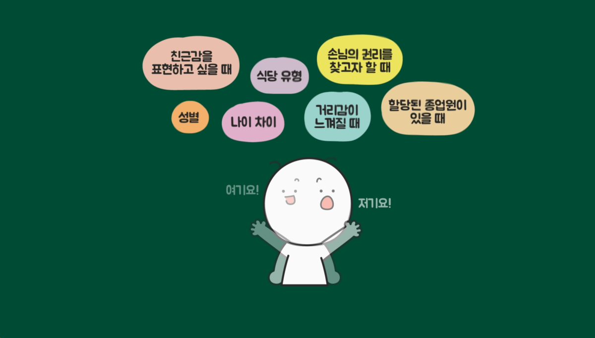 * 이 콘텐츠는 DBpia에서 제공하는 논문 [식당 내 호칭'저기요','여기요'를 대상으로 한 사회언어학적 변이 연구]를 바탕으로 제작됐습니다. (* DBpia로부터 예산 지원을 받았습니다.)