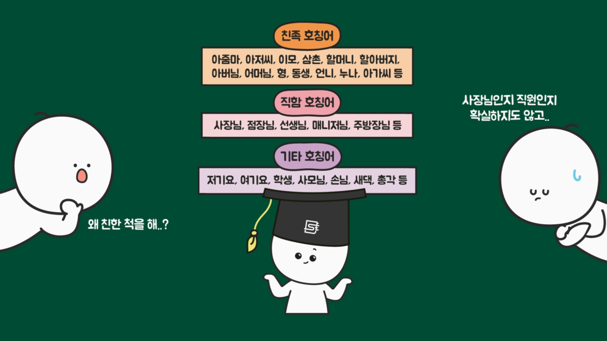호칭을 크게 분류해 보면 친족 호칭어와 직함 호칭어, 기타 호칭어 등으로 분류할 수 있는데, 실제 친족이 아니고, 직함도 모르는 상태에서 해당 호칭을 사용하는 것에 부담을 느끼는 사람이 많은 편입니다.