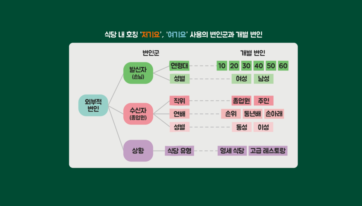 이러한 위계 관계에 영향을 주는 변인으로 발신자인 손님과 수신자인 종업원의 연령대와 성별, 종업원의 직위, 식당 유형 등이 있을 수 있습니다. 이를 변인군으로 하여 설문 문항을 구성해 응답받았을 때 유의미한 결과가 있었습니다.