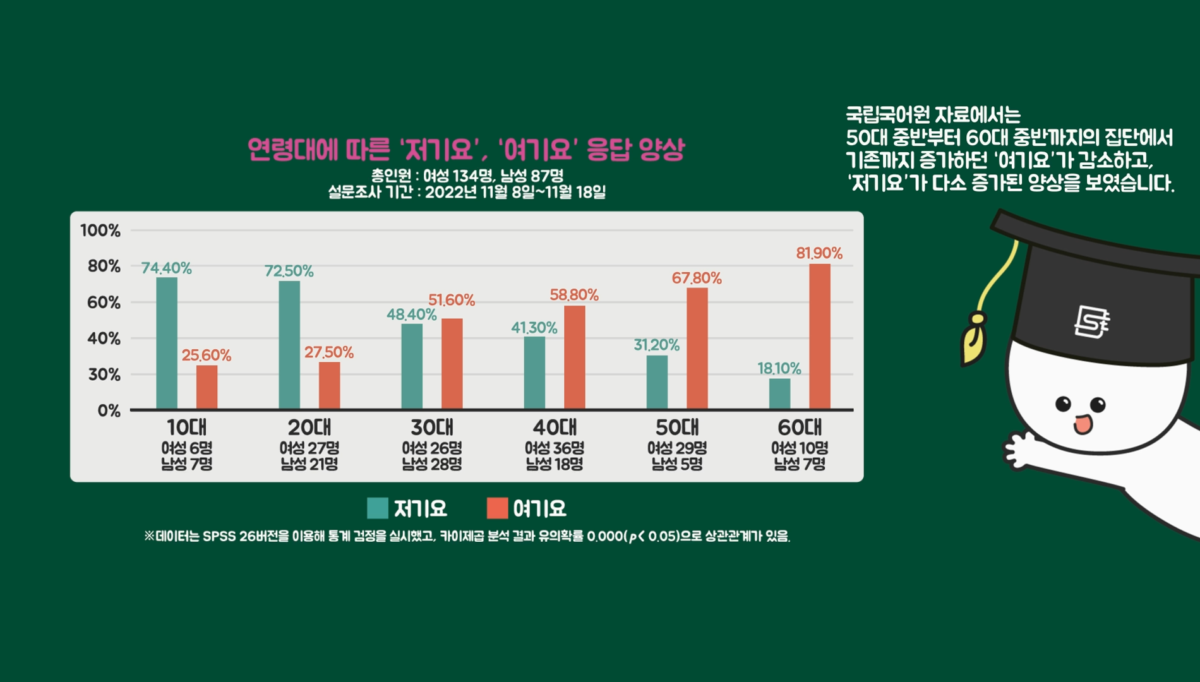 즉, 사람들은 다양한 상황과 조건 등에 따라서 ‘여기요’와 ‘저기요’를 전략적으로 사용하는 편이었는데, 일반적인 상황에서는 대체로 연령대가 높아지면 ‘여기요’를 ‘저기요’보다 많이 사용한다고 할 수 있습니다.