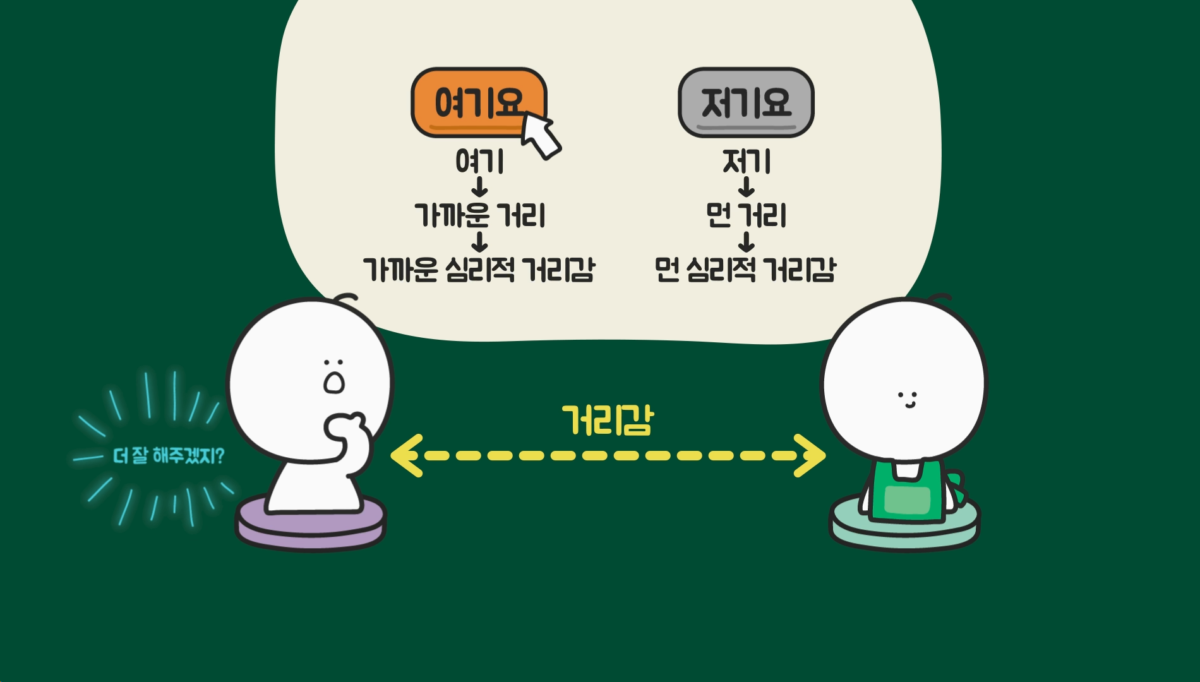 그러니까 공손성을 차리는 것은 격식을 차리는 것이고, 주로 낯선 사람에게 차리는 경우가 많습니다. 그래서 많은 사람이 ‘여기요’보다 ‘저기요’를 심리적 거리감을 표현하는 호칭으로 생각하고, ‘여기요’를 전략적으로 사용했을 수 있습니다.
