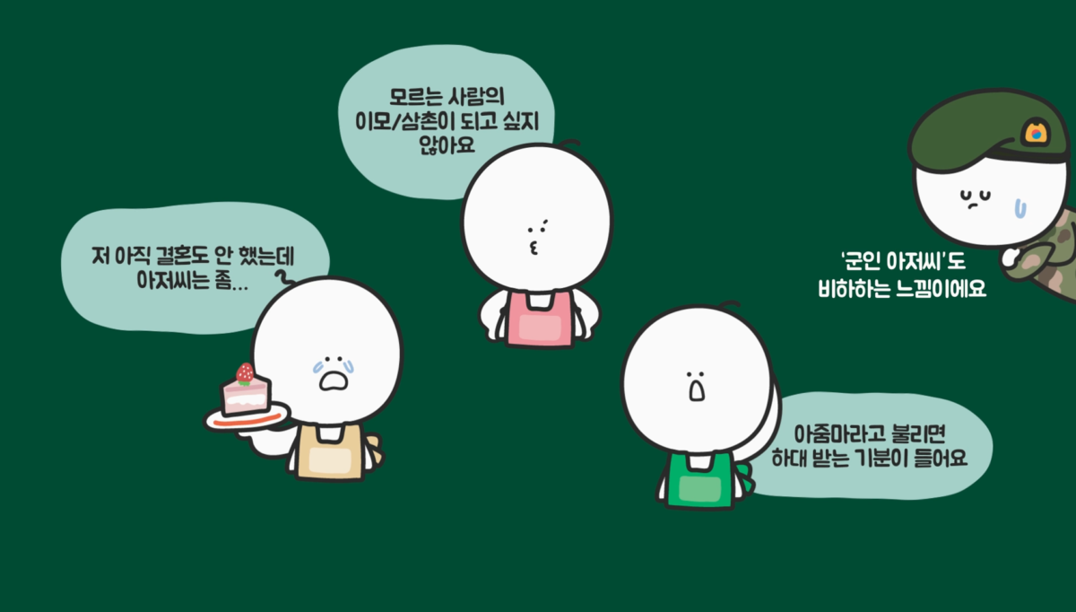 그러면 친족 호칭어을 사용하는 것이 더 좋지 않겠느냐고 반문할 수 있는데, 여러 설문조사에 따르면 요즘은 많은 사람이 아줌마나 아저씨라는 표현을 부정적으로 생각하고, 이모나 삼촌 등의 호칭도 직업적으로 존중받지 못한다는 인식이 있어서 사용을 꺼리는 추세입니다.