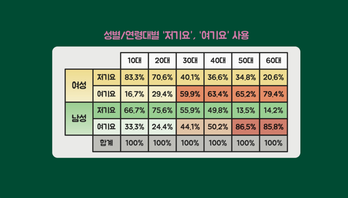 그리고 연령에 따른 응답 결과를 성별 데이터까지 세분해서 살펴보면 위와 같습니다. 보면 여성은 30대부터 ‘여기요’의 사용이 급증하고, 남성은 30대부터 사용이 크게 증가하다가 50대부터 급증합니다.