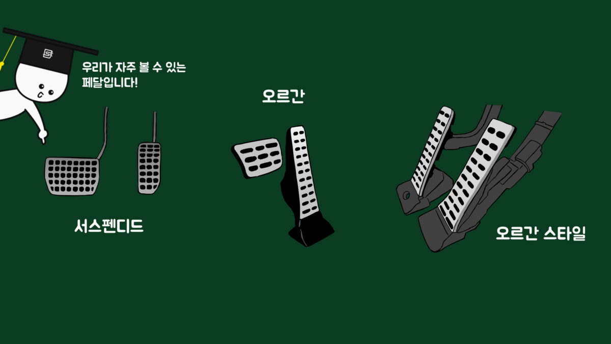 다음으로 페달의 모양에 관해서 알아보겠습니다. 먼저 가속 페달은 서스펜디드 페달과 오르간 페달, 오르간 스타일 페달 등 크게 세 가지 모양으로 구분됩니다. 형태는 다양해도 대체로 가속 페달은 세로로 길고, 브레이크 페달은 가로로 깁니다. 이렇게 만들어진 건 클러치와 브레이크 페달, 가속 페달의 수동 변속기 시절에서 기인합니다.