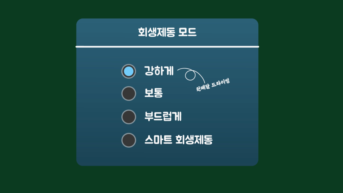 다만, 회생제동의 강도가 강하면 멈추는 속도가 빨라져서 놀이기구를 탄 것처럼 어지럼증을 느낄 수 있다고 합니다. 궁금증이 해결되셨나요?